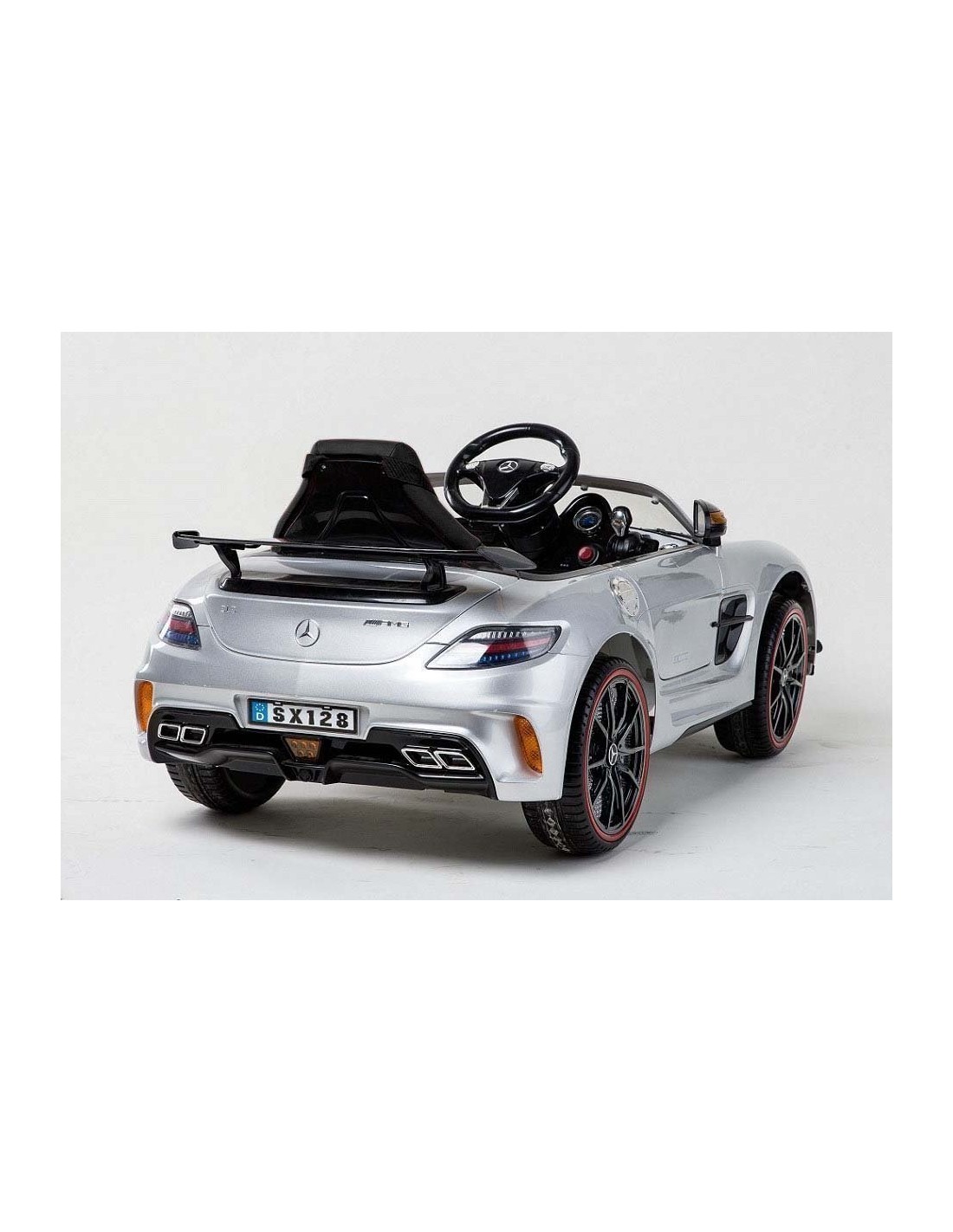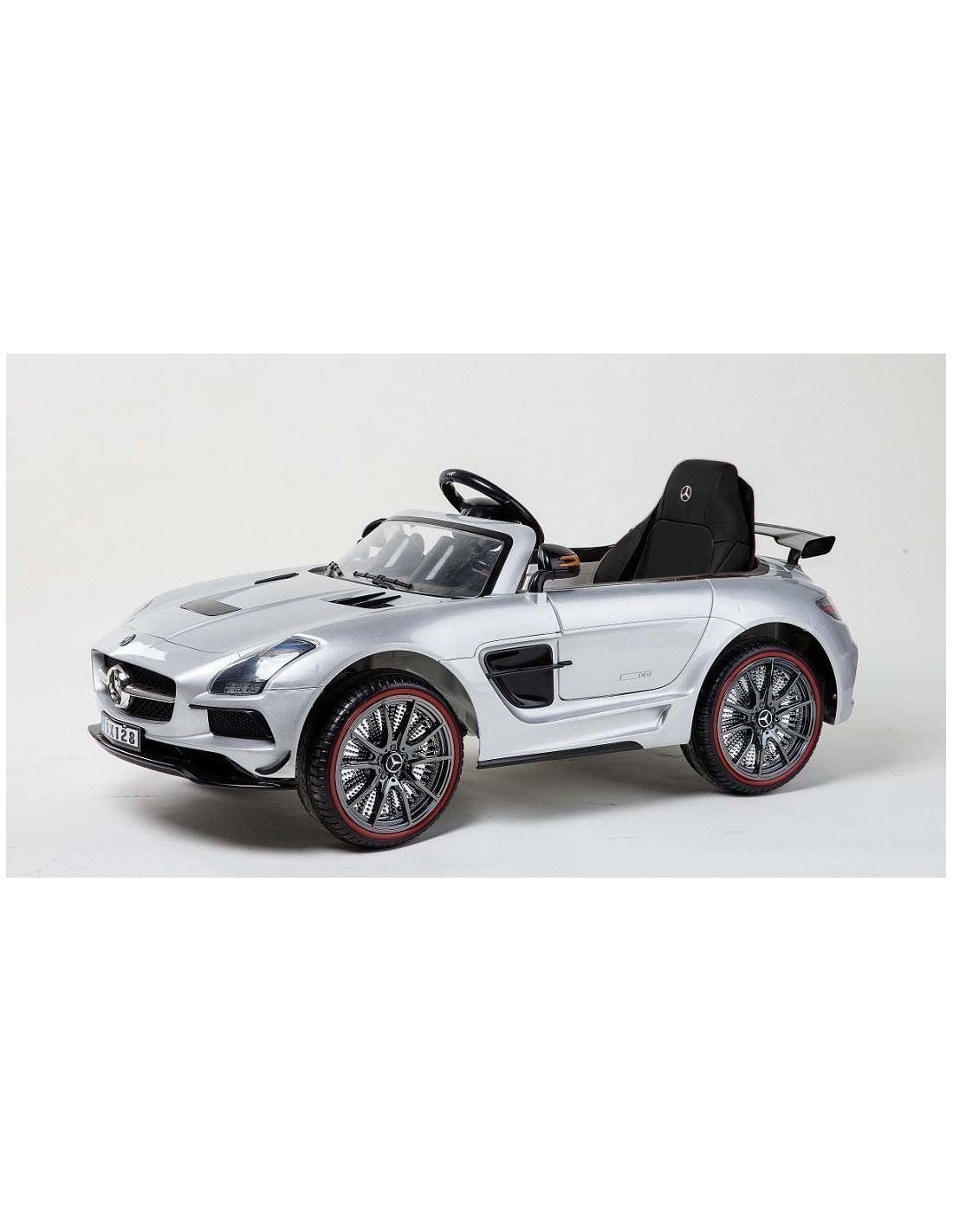 Coche electrico para niños modelo MERCEDES SLS AMG deportivo. Color con pintura plateada. Goma EVA, 12V y dos motores de 35w cada uno!! Con control parental 2.4ghz!! Novedad, direccion electronica asistida y control de traccion!